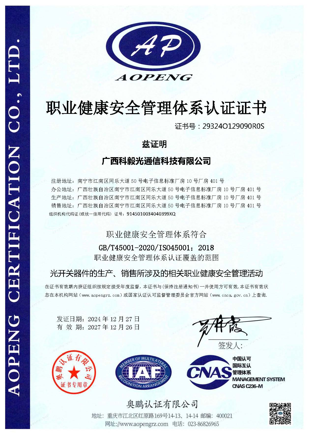 職業(yè)健康安全管理體系認(rèn)證證書(shū)