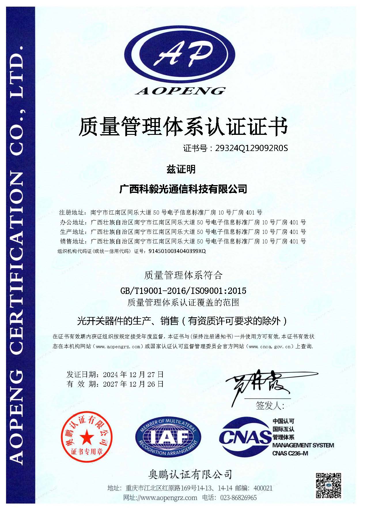 質(zhì)量管理體系認(rèn)證證書(shū)